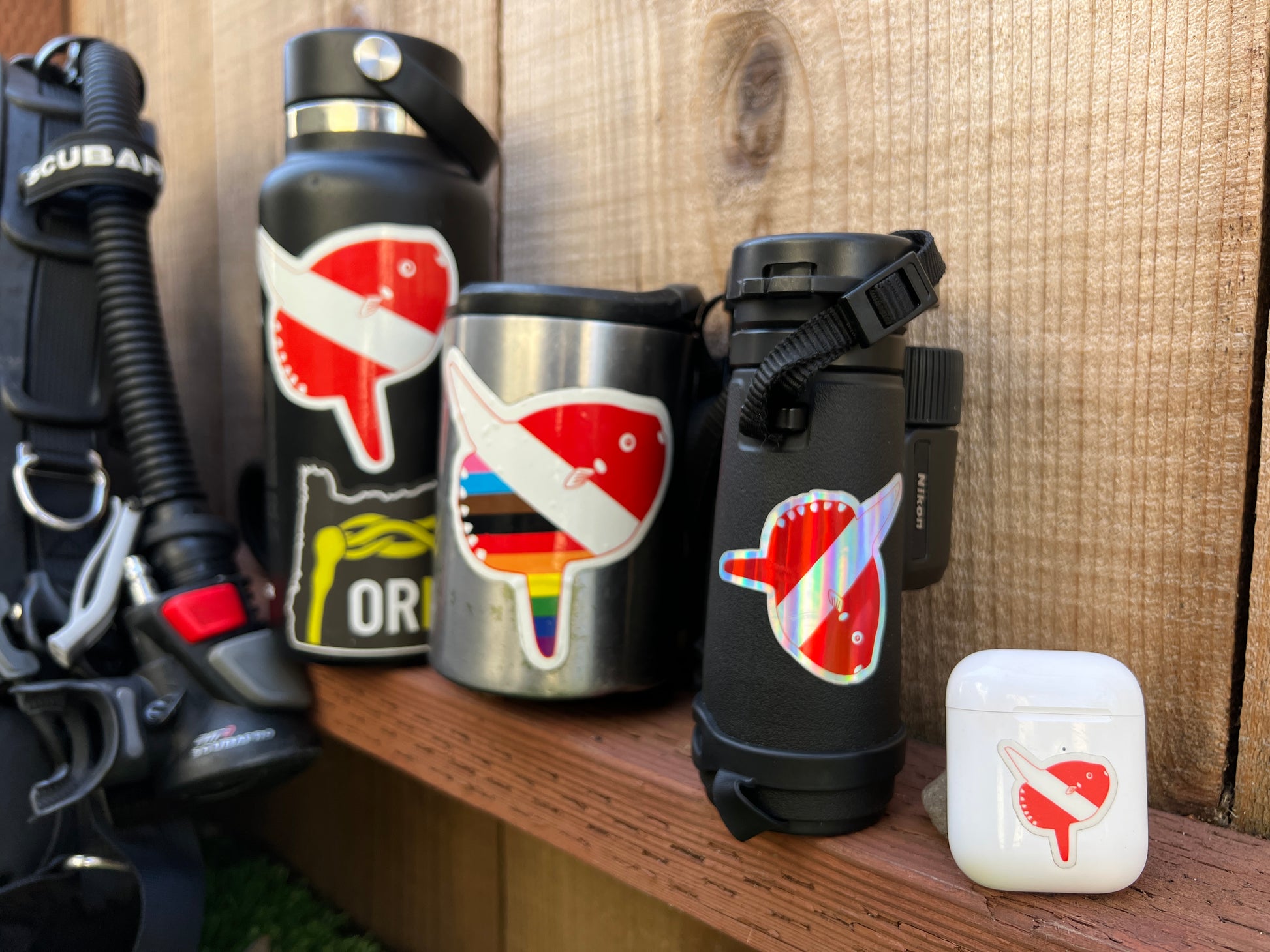 The o-fishy-al dive flag of Monterey Bay, California. Down for coldwater bubble blowers since 2014. Featuring ocean sunfish (Mola mola), the largest bony fishes in the whole wide ocean emblazoned by the international red-white "diver down" flag.