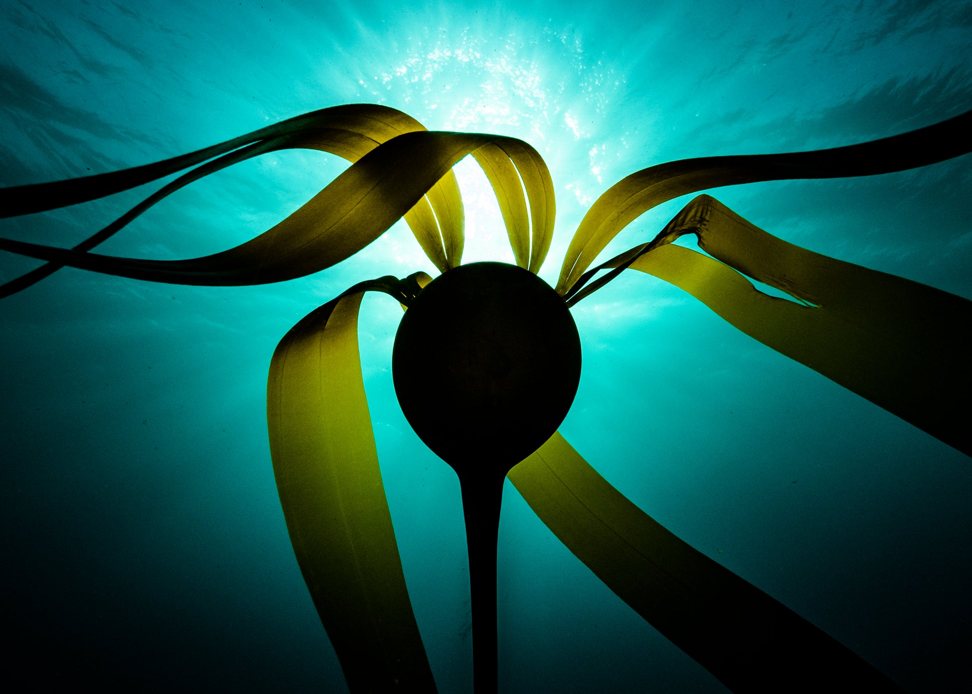 A secretive bulb of bull kelp eclipses the afternoon sun in Monterey Bay, California. January 2022